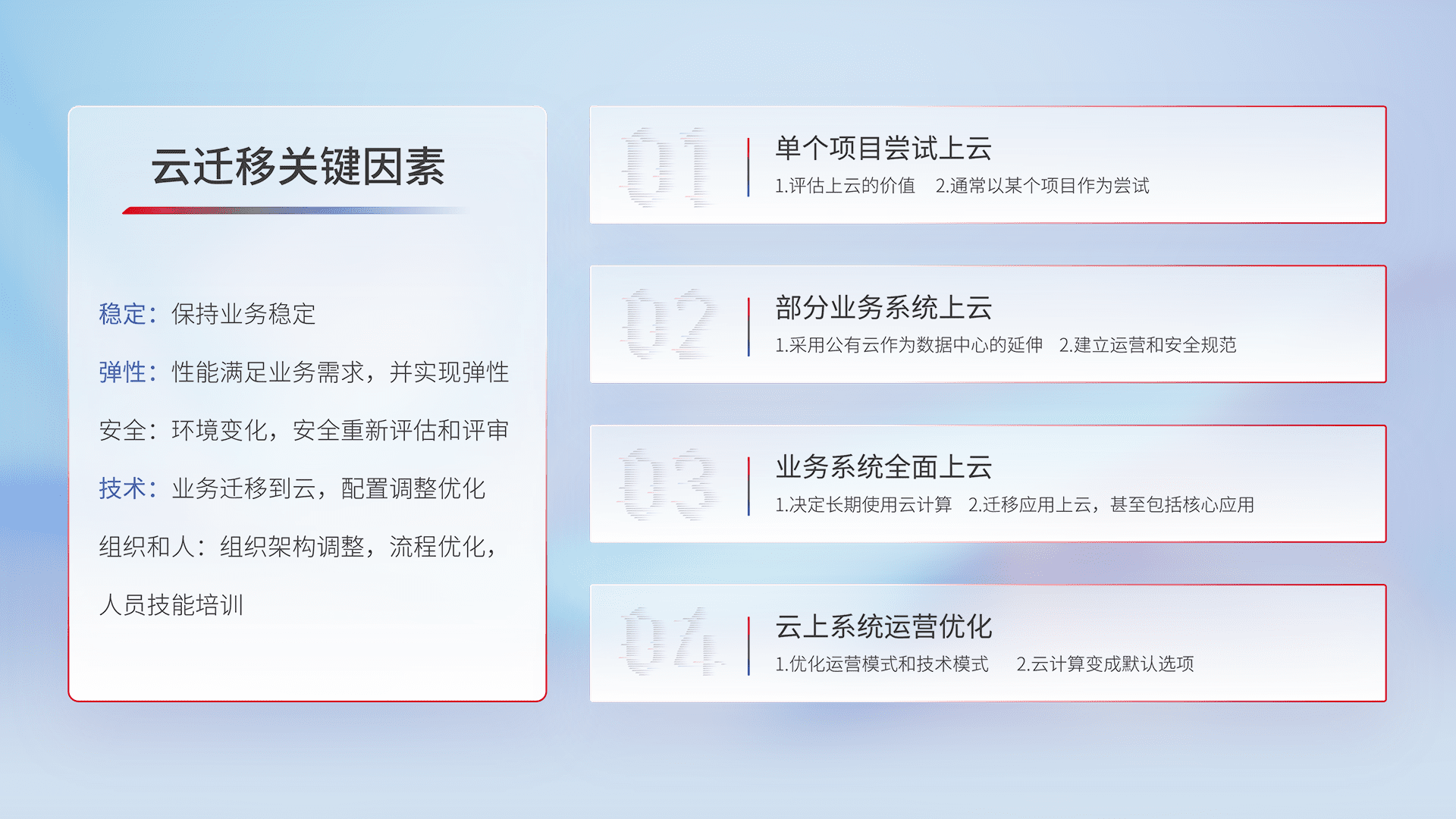 结合实际业务,,从规划设计、、云平台选型、、、、云原生改造、、、、数据迁移、、集成交付,,,,迁移全过程为客户识别最佳上云路径,,做好风险识别管理,,设计网络架构、、、、身份权限、、、、安全审计合规、、、、操作审计、、、、日志审计、、、监控告警策略、、、、多站点容灾设计等,,,对云上基础设施进行整体规划,,,提升IT治理水平,,以满足弹性、、、、高可用、、、高性能的需求。。。