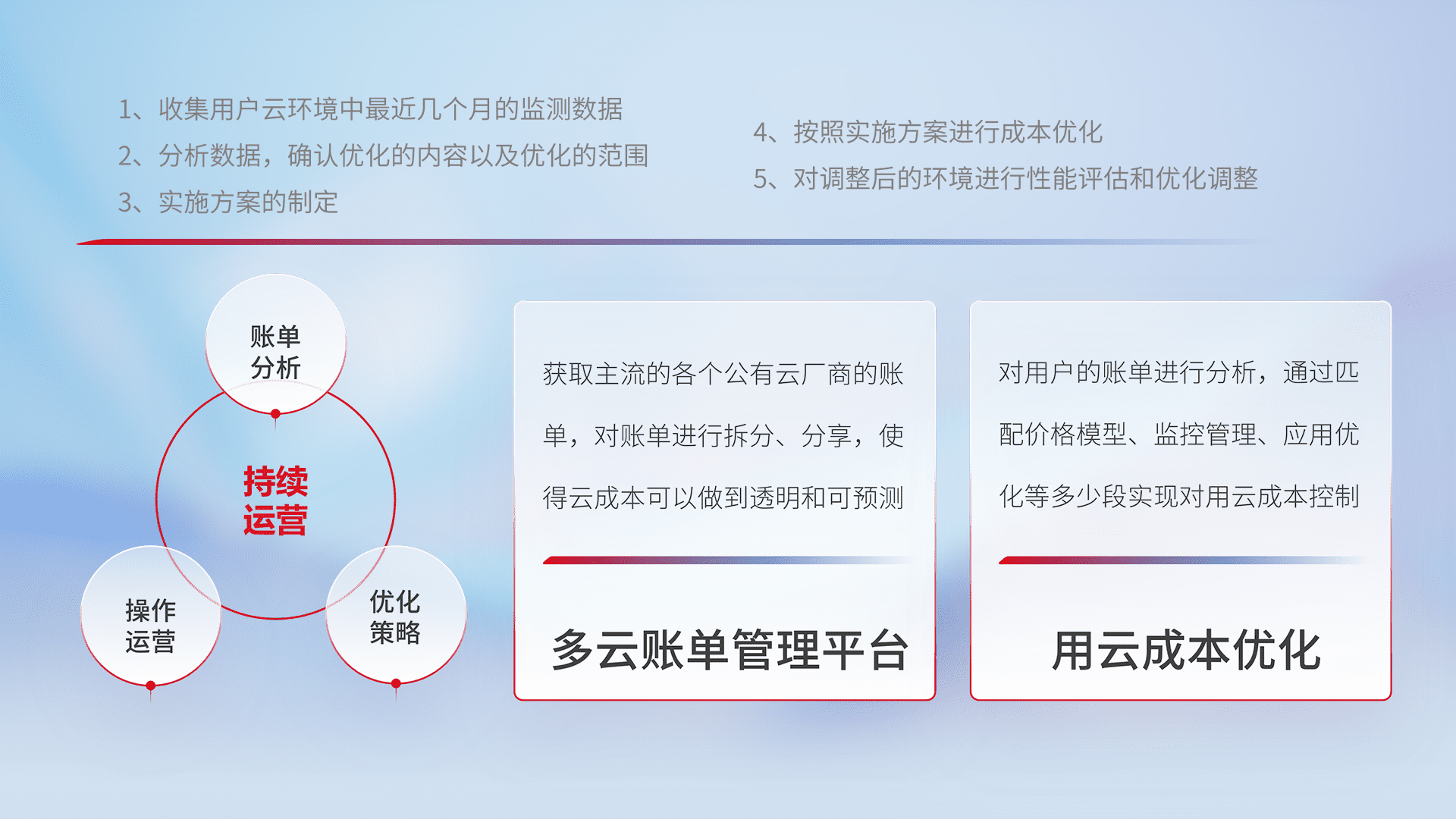 通过灵活运用多种自动化迁移工具,,,帮助企业用户实现业务和数据高效 、、稳定的上云迁移和云上迁移,,采用自研多云纳管平台,,,以中立管理模式,,,解决多组织、、、多云、、多运维厂商的复杂关系的管理,,保证多云平台资源配置的一致性,,,实时掌控云资源运行数据,,,,运用智能化工具分析云资源多云平台的管理服务,,,,透明化管理成本支出,,,,用云成本可预测、、、用云费用可优化、、、、云资源配额有据可依。。