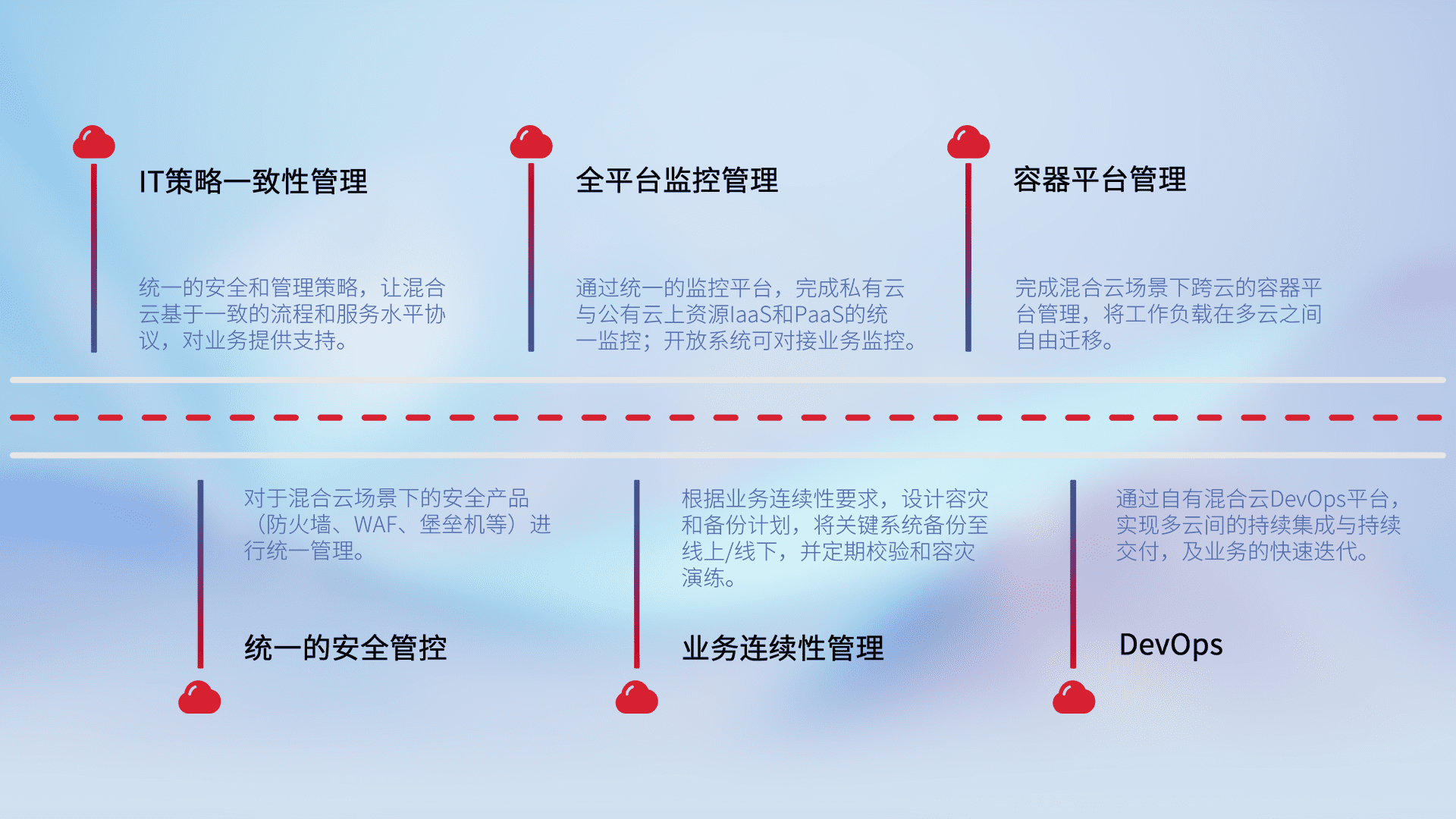 通过多云纳管,,以统一的资源数据模型把客户的云资源进行抽象和封装,,,,进而实现对多云资源的统一操作,,,,保障云资源管理的可靠性、、稳定性与可用性。。。。量身定制化运维内容,,,配置、、开发运维、、补丁管理、、、、备份、、、、监控、、认证和访问管理、、、、审计和日常巡检等,,,,保障在用云过程中的可靠度,,,,稳定度以及高可用率。。。